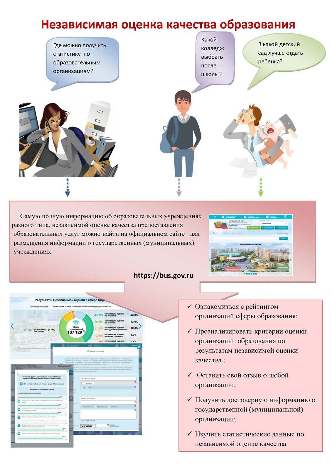 Сайт www.bus.gov.ru реализует возможность оставить свой отзыв гражданами о качестве услуг, предоставляемых образовательными организациями, с приглашением заинтересованных лиц воспользоваться предоставляемым ресурсом и принять участие в оценке деятельности образовательных организаций.